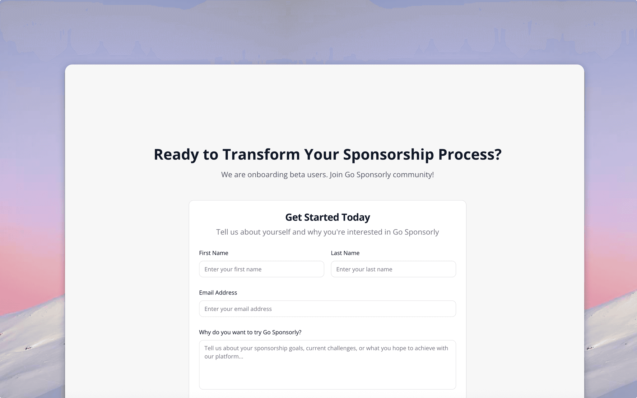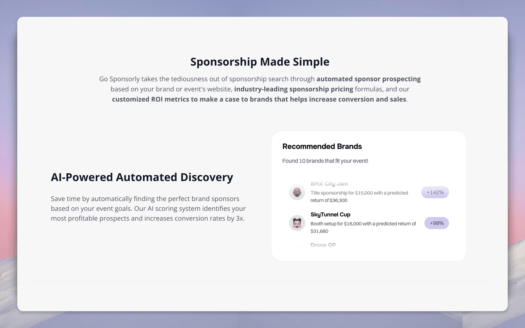 Go Sponsorly was an AI-powered sponsorship platform helping event organizers find and close brand deals faster. The product was ready but had no landing page to communicate its value or drive signups. I led the design from scratch, focusing on clear SaaS messaging and conversion.